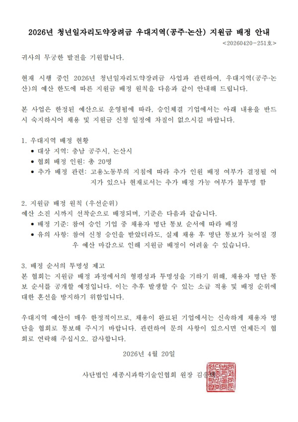 [2026년] 우대지역 지원금 배정 공지 - 충남 공주시, 논산시만 해당